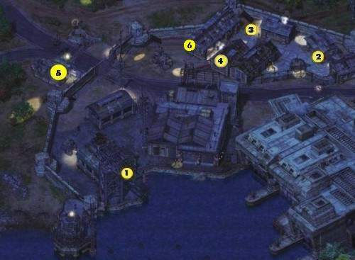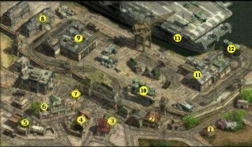Přesuňte se do zahrady u domu (4) a nalákejte rádiem dovnitř vojáka u zdi. Do zahrady se dá nalákat na cigarety ještě jeden voják. Pak nalákejte dalšího vojáka do uličky a opatrně se přesuňte do krajního domu (6) kde je Nataša. Vejděte dovnitř v okamžiku kdy bude admirál vzadu a rychle všechny zlikvidujte. Promluvte si s Natašou a předejte jí věci. Nahoře jsou jen tři vojáci a vydejte se ven. Venku zabijte námořníka před dveřmi a vojáka který chodí po chodníku nalákejte a zlikvidujte. Vydejte se směrem k velkému domu. Odstraňte vojáky u zaparkovaného auta a vojáka u budovy. Vyčistěte celé okolí budovy a přitom si dejte pozor na stráž na střeše a na civilistu, který nakládá věci do auta. Nesmí vás vidět, jinak uteče od auta a nepozorovaná cesta do přístavu se uzavře. Do budovy vejděte bočním vchodem a jakmile zabijete prvního vojáka odneste ho rychle ven. Pak sem přesuňte celé mužstvo a promluvte si spolu. Vyčistěte následně celou budovu a prohledejte jí. Musíte najít dva bonusy. V domě (5) je dole pět vojáků kteří nejsou problém a najdete pár věcí. Nahoře jsou vojáci dva které musíte zlikvidovat tak aby Vás neviděl civilista. Ve skříních jsou nějaké věci, žebřík a hlavně bonus. Ve vedlejší budově nic není a tak se vydejte do budovy vedle domu (6). Dole jsou tři vojáci a nahoře v bedně je bonus. V dalším domě (druhém od 6) jsou dole tři vojáci a bonus. Nahoře je jeden voják a další bonus. S Natašou se podívejte ještě do budovy (7). Je zde další bonus a pak se vraťte do domu (4). V předu je důstojník s vojáky. Umístěte do střední místnosti rádio a nechte pootevřené dveře. Vojáci se půjdou podívat a vy použijte 1-2 granáty. V přední místnosti je bonus a další věci. Do přístavu se vydejte náklaďákem který vozí zboží (doufám že jste nevyplašili civilistu) a jakmile auto zastaví jděte rovnou do skladu (8) a vyčistěte okolí. Pak zaskočte do zadního menšího skladu. Zabijte důstojníka a na vojáky použijte granát a prohledejte bedničky. Pak se přesuňte k autu a postupně odstraňte hlídky. Vojáka před velkým skladem (9) nalákejte a pak toho co ne něj vyděl. Ve skladišti jsou jen vojáci a tak se zaměřte na kontejnery před skladištěm. Nataša zabaví vojáka u vchodu a vojáka který chodí kolem kontejnerů vylákejte.Položte rádio mezi hangáry a odlákejte vojáka u hangárů. a pak vylákejte jednoho z dvojice povídajících vojáků. Pak zlikvidujte vojáka který se dívá směrem na hangár a nakonec toho u Nataši. Ta se pak přesune k vojákovi na zásobníku (10) a tím můžete vyčistit prostor u brány. Je zde voják a pilot. Pak zlikvidujte vojáka pod jeřábem a na zásobníku. Vejděte do budovy u brány a proplazte se k vojákovi který klečí u okna. Pryč s mrtvolou a vylákejte důstojníka od stolu. Odlákejte pozornost obou vojáků (s myší) a odstraňte je. Ve skříních najdete potřebné věci. Za jedněmi dveřmi není nic a za druhými je voják a bonus. Nad schody jsou dva vojáci a do místnosti kde je hodně vojáků hoďte granát. Pak zlikvidujte vojáky nad vchodem. Vydejte se ven a nalákejte vojáka který chodí u zásobníků a s Natašou odlákejte pozornost vojáka který kouká na tank. Tím můžete zlikvidovat hlídku u tanku a vylákat vojáka před hangárem (11). Pak zlikvidujte vojáka u Nataši. Nataša pak odstřelí na zásobnících snipera vojáka blízko něho a v poslední řadě snipera nahoře na lodi (13). Teď se vydejte vyčistit hangár kde je pár dobrých zbraní. Teď uložte nálož pod tank a u zásobníku (10) a schovejte se za bedny kousek od stojících vojáků. Zbytek mužstva přesuňte do hangáru a aktivujte je na střelbu kdyby někdo přišel. Teď postupujte rychle. Vyhoďte tank, potom hoďte na vojáky granát a nakonec aktivujte nálož u nádrží. Pak vyčistěte celou tuto část a dejte nálože k zásobníku (12). Se zlodějem vylezte na jeřáb a přeručkujte po rameni až na konec nad loď. Jakmile se dostanete k zabitému odstřelovači (13) klikněte se Shiftem na připravený žebřík a cesta je pro zbytek komanda volná. Až budou všichni nahoře odpalte poslední nálož u zásobníku a vlezte všichni do kontejneru a mise končí.