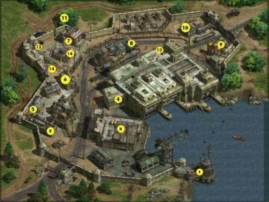 Důstojníka u auta pak zlikvidujete jednoduše. Spooky si pak může vzít jeho uniformu. Pak odstraňte všechny vojáky (nezapomeňte na toho u světlometu) u brány a na polní cestě pomocí cigaret zlikvidujte 4 stráže. Dál už je to moc nebezpečné. Teď už nastupte s celým týmem do auta a projeďte branou. Spooky musí mýt samozřejmě u sebe doklady a být v uniformě. Teď se zaměřte na větší budovu (3) u jeřábu. Vyčistit vnitřek by už pro Vás neměl být problém a prohledejte bedny a skříně. Získáte provazový žebřík, výbušniny a první bonus. Hořejšek uděláte tak že Lopin vyleze nahoru a u dveřích spustíte dolu žebřík. Pak už to je jednoduché a přesuňte se k hangáru. Tam vylezte po žebříku (4) a odstraňte odstřelovače a vojáka. Pak zlikvidujte důstojníka a seberte mu klíče a nakonec vojáka co stojí nahoře. Odstřelovače nahoře se nedá odstranit dokud nezlikvidujete vojáka dole který na něj vidí a vojáka u kolejí. Pak už můžete odstřelovače v klidu zlikvidovat. Vojáka který chodí za plotem nalákejte na schody u stanice a vojáka který stojí můžete na dálku přes plot zabít. Teď se musíte dostat do budovy s trezorem (5), ale brání Vám vtom voják na věžičce kterého zaměstnáte psem a pak zlikvidujete. Budovu pak už není problém vyčistit. Celou budovu prohledejte a mimo jiné najdete dva bonusy. Pak se zaměřte na vojáka na další věžičce a druhého který se tam prochází. Teď se vydáme ke sprchám (6) a zde najdeme další věci a bonus. Od sprch se vydejte do budovy za dělem (7), přitom odstraňte opraváře děla, stráž mezi věžičkami a pak teprve vyčistěte budovu (7). Podívejte se ještě k trafostanici kde odstraníte stráž a dělníka odlákáte z dosahu odstřelovače. Pak se přemístěte na nádraží (8) a zde nejprve vyčistěte levou budovu a pak vejděte do nádraží. Zabijte prvního, klečícího a pak toho co přechází. Pomocí vysílačky zavolejte Tyniho a když se objeví padáček ukažte místo přistání. V místnosti kde jsou 4 vojáci použijte střelnou zbraň a najdete zde pár granátů a výbušninu. Pak odstraňte vojáka před stanicí který si čistí zbraň a nezapomeňte ho odklidit. To, ale asi už děláte sami na všech nebezpečných místech. Vojáka na vyvýšenině vylákejte pryč a zlikvidujte a totéž s jedním z bavících se vojáků. Druhého odlákejte rádiem za stanici a vojáka který na ně vyděl vylákejte na cigarety dolu. Teď se pomalu přesuneme k zásobníkům (9). Tam vylákejte nejprve dělníka ven a pak teprve likvidujte toho na výměníku. Odstřelovač na severu (10) je trochu problém protože jeho mrtvolu mohou vidět procházející vojáci. Na místě kde stál odstřelovač je místnost kde spí voják a je tam bednička s vínem a prášky. V druhé místnosti jsou dva vojáci kteří se dají jedině zastřelit a je zde bednička s nožíkem pro potápěče a výbušnina. Ve strážnici nalevo od hlavních vrat jsou dva vojáci kteří nečiní problémy a v bedničce jsou dva bonusy a granáty. Do druhé strážnice je lepší vlézt horem s Lupinem a obě stráže omráčit a pak Finsem zlikvidovat. Prohledejte bedničku a plamenomet je váš. Po otevření vrátek v bráně nalákejte důstojníka na cigarety (popřípadě na mrtvolu). Když už jste zde zaměřte se na vojáky v okolí auta za branou. jsou celkem čtaři a neměl by to být žádný problém. Ještě že ty němci tak kouří. Vraťte se ještě dovnitř k u zásobníku (9) kousek od psů je v domku jeden dělník kterého zabijte když se otočí a v bedničce naleznete maso které otravte jedem a hoďte psům. Teď se vydejte ven a razantně vykliďte venkovní (11) prostor. Klidně použijte granáty a vše co máte protože v této chvíli vám už je jedno že vyvoláte poplach. Dojděte do bunkru (12) a i ten vyčistěte granáty. Dejte si přitom pozor na vojáka který přijde shora. V bedničce najdete granáty a bazuku a v psacím stole granáty a bonus. Nahoře je další bednička s výbušninou a ve věžičce je bednička s bazukou a léky. Teď již můžete projít postupně všechny budovy a likvidovat jejich osazenstvo granáty a střelbou. Přitom seberte co se dá. V budovách A-1jsou bomby a v A-2 jsou léky a bazuka. V budově kde jsou nastoupeni vojáci jsou bomby a bonus. Vylezte na hangár a vyčistěte celou střechu. Důstojníka u vstupu do hangáru (13) odlákejte a zabijte. V budce jsou dva vojáci kde se dá jeden nalákat (na co jiného než na cigarety a druhý zabít zezadu. Pak otevřete bedýnku a zde je bazuka a dva náboje. Přesně naproti je malý výklenek v kterém je voják kterého zabijte a z bedničky si vezměte granáty a výbušninu. Do hangáru se dostanete tak že shodíte žebřík z výčnělku vedle schodů u psů a Fins po něm vyleze a vleze dovnitř. Zde odstraní patrulujícího vojáka a Lupin pak vleze horem přes vstup a omráčí vojáka u bedniček (klečícího). Potom nalákejte vojáka patrolujícího v blízkosti zadní části ponorky. Druhého zlikvidujte následně a pak patrolu u středového sloupu č.2 nalákejte na cigarety. Dejte si pozor na opraváře ve vypuštěném doku. Potom se zaměřte na vojáka co se dívá dolu a na toho co stojí kousek od něj. Pokračujte přes obě stráže u vlajek (v prostředku mokrého doku bez ponorky). Stráž u suchého doku uvidí mrtvolu a přiběhne. V bedničce u vlajek je výbušnina a granáty. Vojáka před suchým dokem a toho dole nalákejte na cigarety. U sloupu č.1 je bedýnka s plamenometem. Pak odstraňte sedícího vojáka u sloupu č.2 a přitom si dejte pozor na stráž na ponorce. Přejděte k zadní části ponorky a odstraňte klečícího vojáka. Teď vylákejte vojáka z ponorky a pak vojáka u schodů na cigarety a důstojníka přepadněte zezadu. Voják co je nad suchým doke