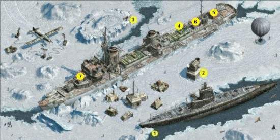 V dalších místnosti je postup stejný, nezapomeňte však sebrat admirálovi uniformu. Pak se vydejte nahoru a zabijte vojáka který tam chodí a ještě výš zabijte oba dva vojáky. Prohledejte skříň a máte uspávací prášky a granáty. Slezte úplně dolu a v další místnosti zabijte opraváře a pak oba zbývající vojáky. Z ponorky vylezte středem ponorky přes kapitánský můstek. Počkejte až bude voják na ponorce od Vás odcházet a pak ho rychle  zlikvidujte. Pak se zaměřte na toho na zadní části a naposled přijde na řadu ten co patroluje z břehu na ponorku. Potom se potopte a přeplavte k přední části ponorky (1) a zabijte vojáka u vody. Mrtvolu schovejte a vojáka před ponorkou nalákejte na cigarety. Stráž u ponorky nalákejte za stan do místa kam nikdo nevidí. Pak zlikvidujte obě stráže u ker a pak nalákejte patrolu za vysílačkou na cigarety. Na ně nalákejte i jednoho z dvojce povídajících vojáků. Pak už je otevřená cesta k druhému a k patrole před vysílačkou. Naposledy se zaměřte na vojáka před vstupem na loď a pak už prohlédněte všechny stany kde naleznete mnoho potřebných věcí včetně teplého oblečení. Do stanu se 3 vojáky můžete hodit granát a toho spícího vojáka není problém odstranit. Po osvobození Inferna ho oblékněte do teplých šatů. Vejděte do domu mezi stany a zabijte vojáka na chodbě a potom velitele. Teď se vydejte osvobodit Tinyho. Je v domku (2) poblíž stanů kde nejprve vylákejte vojáka pře domkem a potom zabijte důstojníka a vezměte si od něj klíče od domku. Po vstupu dovnitř se rychle zorientujte (zalehněte) a vykliďte prostor. Prohledejte bedny a osvoboďte Tinyho a oblečte ho do teplého oblečení.  Pak se vydejte směrem k balónu a zlikvidujte postupně stráž za kopcem a pak nalákejte jednoho z dvojice. Tím se dostanete do balónu a sním můžete vzlétnout a přesunout se přes loď do rohu za letadlo. Zlikvidujte vojáka za letadlem a pak důstojníka. Pak se zaměřte na vojáka a opraváře u letadla a ostatní už není problém. Teď jsou vaším cílem výbušniny (3). Zlikvidujte hlídku která na ně vidí, pak velitele a pak hlídku před lodí a na lodi. Hlídku u schodů vylákejte mimo dosah kulometů a můžete v klidu sebrat výbušninu a jít na loď (4) pomocí harpuny v tomto místě můžete vylézt nahoru. Postupně postupujte od zadu kde odstraníte snipera a vnitřní obsluhu děla (5). Pak obsluhu kulometů ve středu lodě a nakonec přední část. Buď s Tinym přeručkujte až  k hlavnímu stožáru a překvapte je ze shora nebo později s Spookym přijdete zespoda. V jedné skřínce jsou šaty a bonus. Nahoře v místnosti jsou dva admirálové a mají tam kódy, enigmu a součástky na opravu enigmy. Oba dva vojáky co chodí okolo můžete zničit párou až pustíte stroj. O poschodí níž zabijte oba dělníky a prohledejte bedničky. Přejděte do vedlejší místnosti a na chodbě zabijte oba vojáky. Pak vojáka ve sprše a vše prohledejte (najdete 2 bonusy). Kóje s vojáky jsou zatím moc nebezpečné, ale pamatujte si toto místo protože je zde bonus. Přejděte do přední části a po zabití vojáka najdete další bonus a pár věcí. Do dalšího poschodí níž jděte přední částí a zlikvidujte stráže. Prohledejte bedny a získáte věci Spookyho. Teď osvoboďte Spookyho, Lupina a námořníky. Přejděte do druhé místnosti a zlikvidujte vojáky a dělníky. Pak uložte u motoru výbušninu. S námořníky se přesuňte na ponorku a puste se do systematické likvidace nepřátel. Pak dejte výbušniny ještě ke všem 3 dělům (5, 6 a 7) a to zevnitř na místo které je ukázáno v Heplu. Až opustíte loď vyhoďte nálože do vzduchu. Pro ukončení mise musí být všichni námořníci s kapitánem, Lupinem, Finsem a Infernem v ponorce. Spooky (musí mít u sebe enigmu, kódy a náhradní díly) p ak s Tinym nastoupí do letadla.