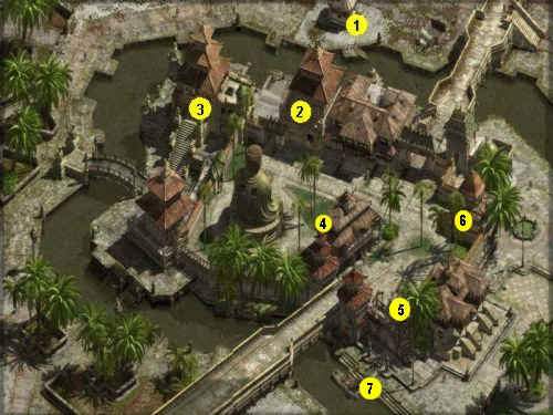 Vyjděte ven a pokračujte k chrámu. Zbavte se obou vojáků před budovou a dovnitř vlezte přes okno. Jakmile se voják otočí slezte dolu a zabijte ho. Zabijte stráž nahoře a promluvte si s tlusťochem. Ve čtyřech bedničkách najdete náboje a granáty. Teď se vydejte ven a zbavte se stráží kolem budhy uprostřed nádvoří. Dejte si přitom pozor na odstřelovače. Postupujte od předu dozadu a pak se můžete podívat do věžičky, kde jsou, ale jen dva vojáci a nic víc. Pak už přijde na řadu odstřelovač (4) který Vám před chvílí tak znepříjemňoval život. Použijte svého odstřelovače a to v tomto pořadí. Muž nahoře v okně, voják který chodí nahoru po schodech, voják který se kouká směrem k budhovi a toho vedle něj. Přes okno zastřelte spícího vojáka a oba muže sedící proti sobě u stolu. Vejděte do domu a zlikvidujte vojáka chodícího dole a dalšího o poschodí výš. Nahoře jsou ještě další vojáci kteří spějí a nejlepší je na ně použít granát. Úplně nahoře je pak mrtvý odstělovač který má zbytečné náboje. Ve spodní místnosti jsou tři vojáci a hlavně zde najdete bonus a granáty. Zbývající dva vojáci už nejsou problém. Dojděte do budovy proti budhovi a zbavte se pěti strážců dole a pak vyčistěte hořejšek. Najdete zde dva bonusy a můžete jít ven k věžičce (5) u mostu, kde je dole jedna stráž a nahoře odstřelovač. Tohoto místa využijte i vy a zlikvidujte vše na co vidíte. Je to trochu ošidné protože mniši uvidí mrtvoly a rychle se jdou schovat. Ve vedlejší budově je bonusový obrázek. Dole je jeden voják a na dalším poschodí jsou dva vojáci kteří na sebe vidí a proto jednoho nalákejte do  místnosti. Z této budovy je taky pěkný rozhled a dají se zlikvidovat zbytky stráží na které jste předtím nedohlídly. Pokračujte dál k vojákům kteří čistí zbraně. Zlikvidujte přecházejícího vojáka a na ty dva použijte molotův koktejl. V prvním poschodí je jeden voják a v dalším dva a hlavně bonus. Ve věžičce (6) jsou dole dva vojáci a bonus a nahoře 3 vojáci kteří se dají zlikvidovat odstřelovačem ze schodiště proti budhovi. Na dva vidíte a třetí se přijde podívat co se stalo. Pak už se vydejte do poslední budovy kam vlezte s Lupinem oknem a zlikvidujte spícího a procházejícího vojáka. Oba pak zabijte a pak postupně vyčistěte celou budovu. Vojáka v prvním poschodí sestřelte odstřelovačem přes okno. Cesa je volná a získáte poslední bonus. Teď se vydejte k náboženskému vůdci a ke Ghurkům. Další postup je dost obtížný a je na Vás. Nejlepší je asi se přesunout do sochy budhy a odstřelovače umístit až nahoru a Ghurky níž do míst kde nejsou okna a ostatní moje vojáky až dolu do zálohy k likvidaci vojáků kteří vejdou dovnitř. Pak jeden Ghurk zavolá rádiem ( SHIFT + kliknout na rádio). Teď nastane peklo. Objeví se nezpočet japončíků a odstřelovač začne likvidovat jednotlivce včetně tyrana. Až Vám dojdou náboje vyjděte z Tinym ven a výstřely k sobě lákejte jednotlivce. Až bude čisto nastupte s vládcem do loďky (7) a je konec.