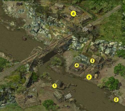 Nezapomeňte prohlednout bednu a získat samopal a výbušninu. Teď vylákejte jednoho z dvojce vojáků k řece do místa kam nikdo nevidí. Po likvidaci mrtvolu neukrývejte a vylákejte vojáka ze schodů před chatrč na cigarety. Ten tím uvidí mrtvolu vojáka a utíká se podívat co se stalo. To je okamžik kdy ho můžete v klidu zlikvidovat a pak se obou mrtvol zbavit v řece nebo je strčit pod budovu. Zde se mohou schovávat i vaši muži. Pak už klidně nalákejte a zlikvidujte vojáka za chatrčí u řeky a opraváře lodě. Pak se podívejte do budovy u auta kde jsou tři nepřátelé které omráčíte s Lupinem a pak dorazíte. Prohledejte vnitřek a naleznete žebřík a bonus. Vojáka u slona nalákejte a zlikvidujte a vydejte se k druhé budově (1) kde jsou čtyři vojáci. Vyčkejte na okamžik kdy je důstojník v druhé místnosti  a voják se otočí zády. Rychle ho zneškodněte a zavřete dveře, aby vás důstojník neviděl a mrtvolu vyhoďte oknem. Potom zlikvidujte důstojníka a pak zbývající dva vojáky. Venku vylákejte vojáka pod mostem a zneškodněte i další dva vojáky. S potápěčem se ponořte do řeky a dostaňte se do místa kde krouží stále dokola krokodýl(2). Sem nalákejte vojáka a pak i další dva. Pak přijde na řadu voják před chatrčí, kterého nalákejte pod stromy. Dejte si přitom pozor na patrolu která obchází kolem chatrčí. Jeden z těchto dvou vojáků se dá vylákat stranou a tam zlikvidovat. Pak se zaměřte na vojáka vpravo a na zbývajícího vojáka z patroly si počkejte za rohem a zlikvidujte ho. Mrtvola by měla ležet tak aby se voják z ohrady přišel podívat a vy ho mohli zlikvidovat. Má u sebe klíč který si vezměte. Pak se zaměřte na vojáky kteří jsou otočeny zády. Teď již mohou přeplavat řeku i ostatní. Nesnažte se, ale zlikvidovat vojáka co kouká na řeku. Je dobře hlídaný odstřelovačem. V domě napravo jsou tři vojáci a nic víc (můžete, ale nemusíte tam jít). Pak se zaměřte na vojáka na schodech a vylákejte si ho na malou plošino mezi schody. Pak vylákejte vojáka který hlídkuje pod mostem a nakonec vojáka nad kůly(3). Vejděte do domu a zabijte důstojníka který se kouká ven a oba vojáky u vysílačky. Zatím se jí nevšímejte a přesuňte se do domu na plošině. Vlezte tam oknem s Lupinem a oba vojáky omračte a následně zlikvidujte. Najdete zde mimo jiné bonus. Teď se vydáme k Guinessovi (4). Je pod dohledem snipera a toho zase hlídá voják. Začneme tedy sním a to tak že ho odlákáme k řece a pak zlikvidujeme odstřelovače. Na mostě zlikvidujte odlákejte patrolu před výbušninou a pak vojáka který patroluje až do tábora. Pak se zaměřte na vojáka u bedniček které po jeho likvidaci prohledejte. Sem za chatrč nalákejte i vojáka který dohlíží na cvičící vojáky a pak zlikvidujte vojáka na konci kolejnic. Teď se konečně dostanete osvobodit Guinesse (4) a hned si sním promluvte. Prozradí Vám že se musíte dostat do domu s modelem mostu (5). Vejděte opatrně spodními dveřmi dovnitř a vyčistěte to tam a prohledejte. Najdete bonus a v další místnosti zlikvidujte odstřelovače. Až bude důstojník který patroluje až k žebříku od Vás odcházet vylezte nahoru a hoďte na něj nůž a další nůž rychle i na druhého důstojníka. Zlikvidovat toho co kouká z okna je už pak hračka. V bedně najdete bonus a přiveďte k modelu mostu Guinnessova a prohlédněte si ho (Shift + klik na model mostu). Dojděte si pro výbušniny (6) a to tak že do tábora se dostanete přes prostříhaný plot v blízkosti kolejí a pak zlikvidujete postupně vojáka který patroluje až za chatrče, vojáka před chatrčí a nakonec vojáka za drátem. Pak už je získání výbušnin sranda a můžete se podívat do chatrče nalevo. Vnitřek vyčistěte molotovem a zbývající vojáci nedělají problém. Ve skříni najdete další bonus a nožík. Dole u řeky je zavěšená klec u které zlikvidujte stráže. Uvolněte klec (Shift a kliknout) a pak během 30 vteřin s potápěčem osvoboďte muže z řeky. Krokodýla který Vás otravuje můžete zlikvidovat pomocí harpuny. Skočte ještě zlikvidovat vojáky u druhého slona a prohledejte bedničky. Pak už můžete vyčistit most a prohledat bedničky uprostřed. Do nich pak umístěte nálože a jděte zavolat rádiem (3). Jakmile přijede vlak tak mise končí.