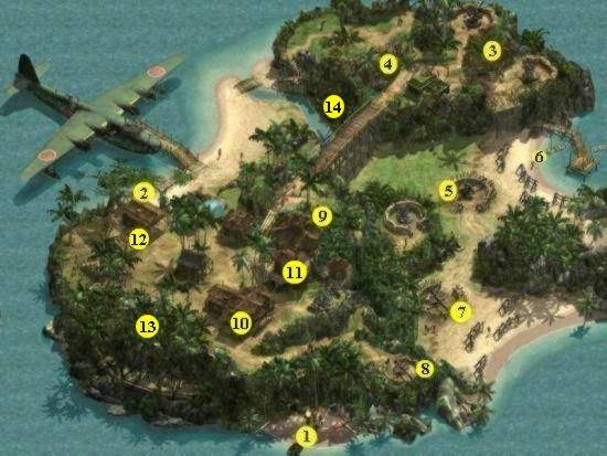 Jednoho z rozpravujících vojáků vylákejte na cigarety ke stěna. Druhý voják a stráž u dveří je pak již sranda. Dveře na konci vedou do místnosti se zlatou opicí a dveře na chodbě vedou k moři. Zbývající dveře vedou do bunkru. Zlikvidujte vojáka a mrtvolu vyneste ven. Pak odlákejte důstojníka který chodí kolem zapisovačů a pak i toho u generála. Pak vyjděte ven a vejděte druhými dveřmi a zlikvidujte zapisovače a generála. Má u sebe klíče (které si samozřejmě vezmete) a najdete zde ještě mnoho potřebných věcí včetně třech bonusů. Přesuňte se s námořníkem k první dvojici pod mostem a zatrubte. Můžete pak jednoho z nich (na toho na kterého nevidí druhá dvojice) zlikvidovat. Pak se s námořníkem přesuňte k té druhé dvojici a zabavte je. Teď zlikvidujete i druhého vojáka z první dvojce a to samé proveďte i z druhou dvojicí. Námořníka přesuňte k dvojici u děla (5) a pak vojáka který se kouká směrem na most vylákejte a zlikvidujte. Pak přijde na řadu obsluha děla a dvojice u námořníka. Pak už jen zbývající trojici vojáků a vyčistit dřevěné molo v zátoce(6). V tomto bodě vlezte s potápěčem do vody. Jsou zde tři potápěči a ve vraku (nalevo) najdete svářecí autogen který použijete na odstranění dveří bunkru. Ve vodě se dejte doleva a zabijte postupně dva žraloky. Pak se přesuňte k dělu (7) a námořník opět zahraje pětici vojáků a tím není problém zlikvidovat tři vojáky u děla a potom ze zadu i tu pětici u bedýnek. .V nich najdete plamenomet a dalekohled. Potom co vyčistíte stráže u dalšího děla(8) je otevřená cesta pro zbytek vašeho mužstva. Vejděte do štoly (doufám že máte klíč), která je v blízkosti bodu (8) a v momentě kdy se voják otočí slezte po řebříku dolu a zlikvidujte ho. Pak se postarejte o dvojici a v chodbě je za dveřmi napravo chodící voják a za dalšími dveřmi je malíř a důstojník. V další místnosti jsou dvoje dveře a za jedněma jsou čtyři vojáci a důstojník. Není to problém a dole naleznete granáty. Za dveřmi které vedou směrem ven ze štoly jsou tři vojáci. S námořníkem zatrubte dvoum důstojníkům u mostu tak aby neviděli na dva vojáky pod nimi které pak odstraňte. Voják který patroluje mezi chatrčemi a chvílemi viděl na oba vojáky vylákejte na cigarety a pak již můžete osvobodit pilota v kleci (9) v jezírku. Vraťte se zpět ke štole a vejděte do vchodu vedle štoly. Zlikvidujte vojáky vevnitř a i toho který pracuje na chodbičce. Pak vylákejte dalšího vojáka na chodbičku a zabít pak jeho velitele je už sranda. Vyjděte spodním vchodem a vejděte hned do vedlejšího vchodu. Tři vojáky kteří zde jsou není problém zlikvidovat. Získáte bonus a výbušninu. Vydejte se směrem nahoru a odstraňte stráž na cestičce mezi body (8) a (10). Pak pokračujte systematicky. Vojáka co vidí na cestičku, vojáka za bunkrem, toho co kouká z okna na bunkr, toho co si sním povídal, vojáka před bunkrem, patrolu která chodí do kola na chatrči(11), vojáka před chatrčí, vojáka nad dělem a pod ním. Většina z nich se dá na něco vylákat (cigarety, víno). Do prostřední chatrče (10) vejděte dveřmi od cestičky v okamžiku kdy bude důstojník listovat v novinách u dveří. Rychle opusťte místnost i s mrtvolou a vyčkejte si na vojáka který chodí do této místnosti. Zbytek je už je sranda a můžete se vydat do budovy s odstřelovačem. Dole je jeden voják a najdete zde bonus. Po odstranění odstřelovače najdete v malé místnosti žebřík a léky. Pak odstraňte granátem šest vojáků u loďky a dojděte si do budovy (12) pro bonus. Jděte nazpátek do podzemí do chodby kterou jste ještě nestačili vyčistit. Zlikvidujte tři vojáky a v další místnosti dva. Za dveřmi vpravo jsou vojáci a pár věcí, za dveřmi ve středu je bonus a pár věcí (hoďte tam granát). Dveře vlevo vedou k dělům kde jsou tři vojáci. Ve skříni jsou dva bonusy a další užitečné věci. S výtahem vyjeďte nahoru pro Inferna která má nálože a přesuňte se ke dveřím do bunkru (13). Ty se dají odstranit autogenem. Teď uložte pod děla nálože a přesuňte celý tým k letadlu. Stráže před letadlem a v letadlu nejsou problém a vydejte se s Infernem a Tinym ke zlaté opici. Vchod je v chatrči (14). Položte u zdi nálož (stlačte SHIFT a ukáže se místo kam) a vyjděte ven. Teď již můžete odpálit všechny nálože a Tiny si dojde pro opici a oba nastoupí do letadla a máte šťastně další misi za sebou.