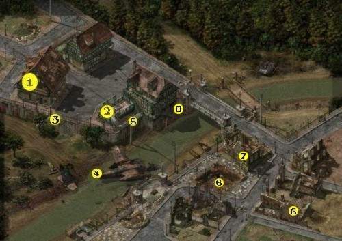 Tím se Tiny dostane dovnitř. Zabijte tři vojáky dole a získejte svářecí autogen. Vyjděte nahoru a baret sleze žebříkem dolu na balkon. Zloděj vyleze na poschodí kde umístil žebřík a vystrčí hlavu ven a sebere žebřík. Zlikvidujte vojáka v první místnosti a stráž vylákejte. Zabijte důstojníka u schodů a spícího vojáka. Prohledejte skříně a získáte bonus a náboje pro snipera. Pozor na jejich používání protože je budete hlavně potřebovat na konci. V koupelně je další bonus a přesuňte se k vedlejšímu domu. Vylákejte vojáka ze zahrádky a pak vojáka který kouká z okna v prvním poschodí na dveře domu (1) Pak zlikvidujte vojáka za opevněním a vojáka za domem. Vylákejte ven vojáka který chodí mezi poschodím 1 a 2. S Lupinem vylezte do prvního poschodí ze strany zahrádky a to úplně nalevo. Pomocí žebříku se pak nahoru dostane i Tiny. Promluvte si s Infernem a zabijte vojáka u dveří. Získáte vyhledávačku min a minu. Vylákejte důstojníka a Lupin vyleze výš a znehybněte snipera a vojáka který kouká z okna ven. Nezapomeňte je pak zlikvidovat s Tinym a v přízemí to taky vyčistěte. Vše prohledejte a získáte bonus, saperskou pušku a granáty. S Lupinem otevřete dveře do zahrady a vyjděte ven. Pak vylákejte z domu u mostu (vedle 2) vojáka který se kouká oknem na dům se zahradou. Lupin pak vleze přes okno dovnitř a odstraní oba vojáky a otevře spodní dveře. Tiny se tím dostane dovnitř a dokoná dílo zkázy a ve skříni najdete bonus. Nahoře zabijte tři vojáky ve předu a pak strážce který bije Dukeho a pak ho osvoboďte. Získáte  pár věcí ze skříní a zbraň od vojáka. Vyjděte ven z domu a postřílejte na druhé straně řeky všechny kteří se dívají na vodu. Pro Dukeho to je sranda. Pak ještě zlikvidujte skupinu vojáků která hlídá most (třeba granátem). Pak vylákejte vojáka který se dívá na schody a slezte dolu a zabijte stráž. Dojděte k letadlu (4) ve kterém je bonus. Dovnitř se dostanete např. pomocí autogenu.Pak přeručkujte přes dráty (5) s Tinym a Lupinem. Vyjděte na malé molo a zabijte vojáka na schodech a pak vojáka v miniaturním opevnění. Lupin pak otevře bedničky a získá dálkovou nálož. Pusťte se do čistky rozbořených domů. V klidu používejte zbraně a granáty. Dost věcí najdete v bedně (6). Zabijte na dálku vojáka na mostě před budkou a můžete vyčistit celé okolí. Lupin pak vleze dírou do domu kde je Smith (7). Píchněte mu injekci a můžete klíčem odemknout dveře. S Lupinem dojděte k díře u řeky (8) a vlezte dovnitř. Jsou zde čtyři vojáci a v trezoru kódy. Smith pak zavolá rádiem a mise končí.