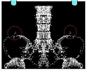 V červenom krúžku sú jasne vidieť abnormálne útvary. Jedná sa o ladvinové