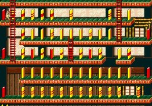 - slezte po žebříku až úplně dolu a vezměte za řebříkem kostku se kterou skočte na rozvírající. totéž opakujte o patro výš, ale až nahoře musíte vzít kostku zprava ze shora a stou skočit na rozvírající. Teď teprve jděte strčit do poslední řady.