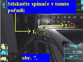 Projděte hned prvními dveřmi doleva, v chodbě odbočte znovu doleva a vstupte do dveří označených nápisem MAINFRAME LAB, propleťte se uličkami mezi rozvodovými skříněmi a u té poslední vlevo přehoďte červený spínač, označený nápisem NAKATOMIGUARD MAIN SYSREM RESET. Nyní se vraťte zpět do první místnosti, vstupte do prosklené místnosti před vámi, projděte dalšími dveřmi, pokračujte přes dveře s nápisem CONTROL ROOM, kde vystoupejte po schodech až k prvnímu řídícímu panelu (obrázek 23.). Před vámi je osm červených tlačítek, čtyři z nich se posunují vertikálně a čtyři zbývající horizontálně. Nyní je tedy musíte ve správné pořadí všechna přehodit a to zprava doleva a seshora dolů, přičemž začněte těmi, co se přehazují vodorovně a teprve potom těmi, které přehodíte ve svislém směru. Po každém přehození svislých tlačítek spatříte krátkou animaci, v níž zjistíte, jak jste se lehce zbavili několika nebezpečných gangsterů, přičemž se vám tak i objeví místnosti, přes které budete muset pokračovat dále. Otočte se, jděte k dalšímu panelu, na kterém přehoďte jediné červené použitelné tlačítko, tak jste vypnuli elektronické uzamčení místností. Vraťte se teď zpět do přízemí, známou cestou se vydejte zpět přes dveře do MAINFRAME LAB, doufám, že vás již po vašich zkušenostech nemusím upozorňovat na to, kde a kdy potkáte další teroristy, takže počítejte s tím, že na ně narazíte téměř na každém kroku. Projděte dveřmi na druhé straně místnosti, pokračujte dalšími dveřmi přes několik laboratoří (viděli jste je v předchozích animacích) až do instruktážní místnosti, zde máte dvě možnosti. Pokud si chcete zastřílet, pokračujte dveřmi vlevo, kde můžete postřílet spousty zmetků a zchladit si tak za předchozí utrpení na nich žáhu, ale tato cesta do dalšího pokračování nevede, takže se po eliminaci všech darebáků musíte stejně vrátit zpět do instruktážní místnost a pokračovat dál dveřmi vpravo, tudy se už konce této části dopídíte. Tak se dostanete až do kanceláře, projděte jí až na další oválnou chodbu, spustí se animace, ve které spatříte, jak bandité týrají Japonce jménem Ozo, aby ho donutili promluvit. Jakmile tito parchanti od něj odejdou, rozstřelte ochranné sklo a proskočte do místnosti k Ozovi, ukažte mu vaši placku a pohovořte si s ním. Nejdříve si zase hru uložte, postavte se poté ale tak, abyste ho kryli, neboť po chvíli se otevřou dveře a bandita bude chtít Oza odkrouhnout, což nesmíte dopustit, neboť byste v tom okamžiku skončili. Mějte tedy připravenu zbraň a jakmile se jen dveře pootevřou, palte o sto šest. Jakmile darebáka skolíte, proskočte zpět na ochoz, jděte doleva a protějšími dveřmi vejděte do chodby a přes další dveře se dostanete k posledním dveřím s nápisem EXIT, vstupte a můžete si na chvíli opět oddechnout.