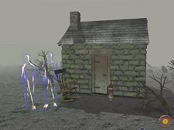 jsou dva duchové. Klikni na ně. V jediné přístupné chatě seber nádobu