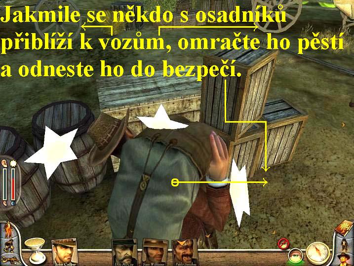 0000006284_n05.jpg (118227 bytes)Po skončení úvodní animace se ocitnete uprostřed vozové hradby osadníků, kteří s obavami očekávají nájezdy krutých a nemilosrdných indiánských nájezdníků. Uprostřed kruhu jsou nejen osadníci, ale zde na vás již netrpělivě očekávají i vaši dva přátelé, tedy Sam Williams a Pablo Sanchez. Rozestavte se tedy všichni po obvodu vnitřní vozové hradby a přepínejte se na všechny čtyři postavy, tak nejlépe využijete všech možností všemožných triků a fíglů, tedy všech vlastností u všech postav. Nájezdníci objíždějí vozovou hradbu zvenčí na koních a vy je musíte likvidovat. Problém je v tom, že žádný z civilistů, tedy osadníků vám nesmí zemřít, pokud by se tak stalo, skončili byste. Osadníci se sice sami kryjí před palbou útočníků, bohužel mnohdy tak nešastně, že se schovávají za vozy a předměty poblíž vozové hradby a stávají se tak snadným terčem útočníků. Musíte tedy bedlivě střežit i je a pokud se ukryjí na zcela nevhodné místo, potom je bez milosti skolte jako John pěstí (obr.5) a odneste je na zádech do bezpečí, kde je položte, však oni se proberou a na chvíli máte od těchto vyděšených hazardéru vystaráno. Jakmile zlikvidujte první skupinu nájezdných indiánu, zaútočí druhá, již mnohem početnější, stejným způsobem musíte zdolat i tuto, stále však po očku sledujte osadníky, budou stále nervóznější a tím i nevyzpytatelnější. Není však všem dnům konec, poté co se zbavíte i těchto neřádů, zaútočí třetí vlna nájezdníků, je nejpočetnější a tudíž i nejnebezpečnější. Tady a byste měli oči na stopkách a co chvíli se přepínali, samozřejmě že musíte občas se nejen starat o bezpečí osadníků, ale sbírat i náboje a jiné užitečné předměty. Likvidace poslední skupiny útočníků je nejobtížnější, nicméně jakmile se vám to podaří, tak tuto část úspěšně zakončíte.