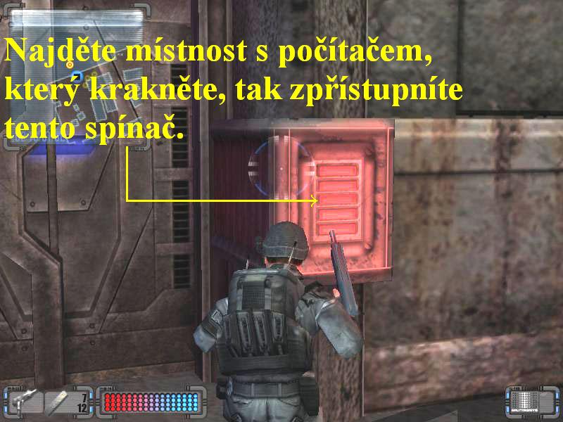 nepřátele, za dveřmi vpravo crackněte počítač, vraťte se a jděte dál přes