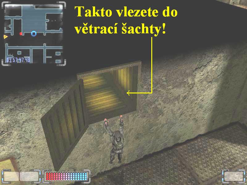 vlezte do ventilace. Na druhé straně seskočte, postupně prohledejte všechny
