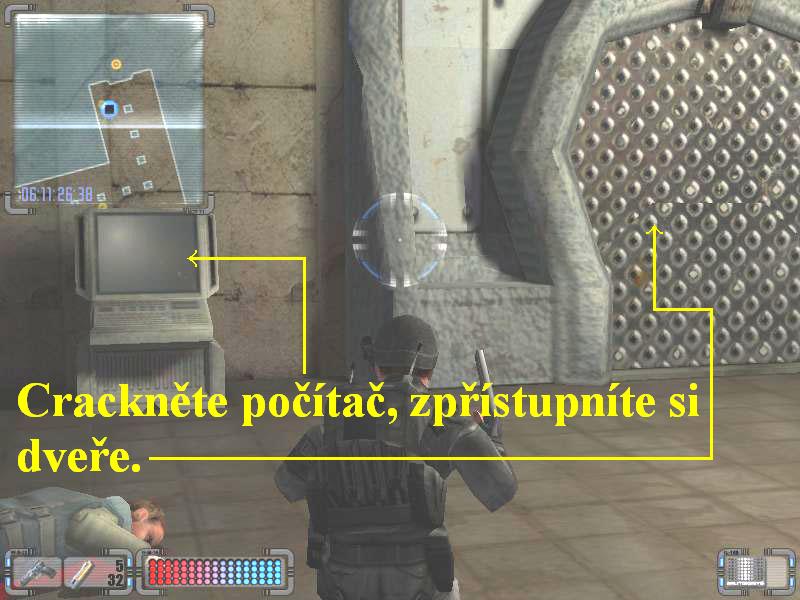 vojáky, vpravo crackněte počítač, zpřístupnili jste si další dveře.