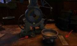 Přejděte ke stolu v popředí. Na stole stojí hrnec. Zapalovačem