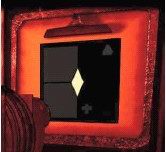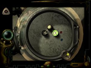 Vyjděte z výtahu a jděte vlevo ke stroji s třemi koulemi spojenými tyčí. Zmačkněte dolní přepínač vpravo tak aby se koule začaly hýbat a ukázaly nad světlem číslo jako na obrázku. Potom zmačkněte páčku vpravo a pokračujte ještě dvakrát stejně. Když uděláte všechno správně, dostanete: oranžová – I, modrá IV, zelená IX .