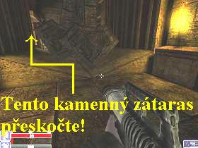 Konečně jste se tedy ocitli uvnitř chrámu, projděte chodbou, odbočte doleva, popojděte vpřed, otočte se doleva. Kolem pravé zdi si opatrně a rychle přeskákejte až na druhou stranu, pozor na to, že podlaha pod vámi se propadá, raději si tedy hru nejdříve uložte. Na konci pak prohledejte místnost vlevo, vraťte se a pokračujte dál chodbou doleva. Na konci odbočte vpravo a prostřílejte si cestu vpřed, odbočte doprava, spustí se animace, zjistíte, že vojáci na vás nastražili past v podobě kyvadel. Zastřelte oba bastardy za kyvadly a nyní musíte mezi skulinami proskákat dopředu na druhou stranu, nejlépe to jde zprava. I tady si hru před zahájením přeskoků raději uložte, určitě si budete muset tento kaskadérský kousek párkrát zopakovat. Za kyvadly odbočte dvakrát doleva, slezte dolů po žebříku, popojděte vpřed, spatříte další animaci, ve které budete považováni za ďábla, po jejím skončení pokračujte v cestě dál. Odbočte znovu dvakrát doleva, prostřílejte si cestu vpřed pravou stranou. Vpravo před vámi vlezte do malého bazénku, na druhé straně z něj vylezte, obejděte ho zprava, zastřelte vojáky, vydejte se do chodby vlevo a zabočte doprava. Na konci odbočte do další chodby vlevo, prostřílejte si cestu až na konec, opět odbočte doleva. Prohledejte prostor pod prkny před vámi, vraťte se a vyjděte po schůdcích zpět, pokračujte vpřed po prknech, přeskočte pravou stranou přes bedny, picněte vojáka, jděte vpřed a vlevo seběhněte dolů po schodech. Zlikvidujte vojáky, odbočte doleva, v místnosti sejměte vojáky, jděte až na konec, odbočte vpravo, kde zastřelte posledního bastarda. Vraťte se zpět do místnosti, kde je čtvero schodišť, odbočte k tomu prvnímu zprava, které je zataraseno kamennými bloky, přes které přeskočte, jde to ztuha, ale jde to (obr.7). Po schůdcích vejděte do chodby, skrčte se a popojděte vpřed, odbočte doleva, pokračujte dopředu, poté se vydejte dvakrát doleva, skrčte se, popojděte dál, odbočte doprava a seskočte dolů do otvoru v podlaze. Nejdříve postřílejte vojáky, opatrně seskákejte dolů, prostřílejte si cestu do chodby nalevo, odbočte doleva, doprava a opět doleva. Za neustálé likvidace vojáků kolem kamenného sloupu pokračujte zprava dál vpřed, opět zprava obejděte kovový regál, na konci chodby odbočte vpravo. Pobijte před vámi nepřátele, sejděte dolů po schodech a na druhé straně vyjděte po druhých schodech nahoru, právě jste zakončili tuto část.