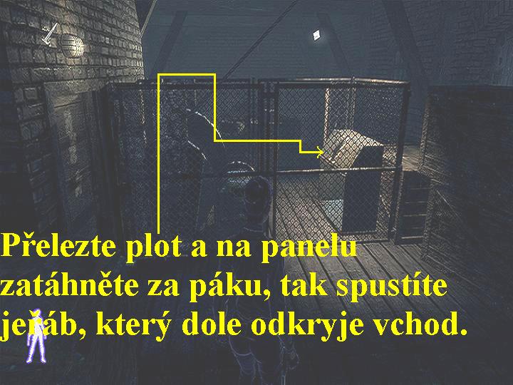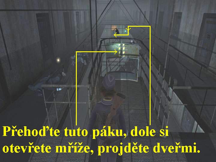 Ocitli jste se tedy ve sklepení budovy, kterou zabralo po sebe Gestapo, vaše pocity jsou velmi smíšené a stísněné, máte totiž před sebou jediný úkol, dostat se k vašemu poslednímu agentovi Radekovi a podat mu ampuli s cyankáli. Vydejte se tedy vpřed protějšími dveřmi, projděte chodbou a poté druhými dveřmi, pobijte fašisty, dveřmi před vámi dál neprojdete, neboť je před nimi kaluž vody pod elektrickým proudem, vstupte tudíž do dveří vlevo. I zde zlikvidujte fašouny, odbočte doleva, vpravo je morfin a ve skříňce zbraň a munice, jděte vpřed a na konci odbočte doprava, projděte dveřmi. Slezte dolů po žebříku, zabijte nácka, mrtvole seberte klíč, vyběhněte nahoru po schodech a přehoďte páku, teď jste vypnuli elektrický proud. Na dveře vpravo použijte klíč, projděte jimi a nyní se musíte chodbičkami vrátit až do chodby ke dveřím, kterými jste nemohli projít, nyní již kaluž vody pod proudem není, takže dveřmi projděte. Vyběhněte po schodišti nahoru, projděte dveřmi, zbavte se fašounů, na konci projděte dveřmi do místnosti, kde seberte SS uniformu, ze stolku klíč a ve skříni se do SS uniformy převlečte. Vyjděte z místnosti ven, po chvíli zabočte dvakrát doprava a projděte dveřmi, když jste si je napřed odemknuli, v místnosti pobijte nácky a druhými dveřmi projděte dál. Spustí se animace, po jejím skončení opatrně projděte kolem fašounů, máte uniformu SS, a pokud tedy se k nim nepřiblížíte, nebudou si vás všímat a vyhnete se boji. Na konci vlevo vyběhněte nahoru po schodišti, posbírejte vše užitečné a seberte dopis, který si jako vždy v inventáři přečtěte. Postupujte dál po rampě zleva, po schodišti vyběhněte výš, ve výklenku rampy přehoďte páku, dole jste si otevřeli mříže a tak i přístup ke dveřím (obr.2). Seběhněte tedy po schodišti zpět na dolní rampu, po ní pokračujte pravou stranou vpřed, na konci projděte přes mříže, které jste si otevřeli, ke dveřím, kterými projděte. Přejděte na druhou stranu a projděte dalšími dveřmi do místnosti, prohledejte ji a pokračujte dál dveřmi vpravo, tak se opět spustí animace. Po jejím skončení jděte vpřed, ze stolku seberte klíč, prohledejte i druhou místnost, v další místnosti odsuňte na zdi obraz a přehoďte pod ním ukrytou páku, tak jste si na druhé straně místnosti otevřeli tajný vchod. Jděte tedy k němu a slezte dolů po žebříku, pokračujte chodbou vpřed, vstupte do místnosti a rychle se zbavte důstojníka SS, dříve než stačí přivolat posily. Prohledejte jeho mrtvolu, získáte klíč, vracejte se chodbou zpět, vylezte po žebříku nahoru, projděte místností a druhými dveřmi zpět na rampu. Na druhé straně rampy si odemkněte branku a za ní přehoďte páku, seběhněte níž a projděte dveřmi. Zde se už zbavte nácků, projděte dalšími dveřmi, popojděte vpřed, ve skříni se už nyní můžete převléci, pokračujte doleva a zlikvidujte nácka. Pokračujte doprava, zlikvidujte další fašouny, vstupte do chodby, přehoďte páku a na konci chodby projděte dveřmi, zbavte se SS důstojníka. Přistupte k Radekovi a podejte mu ampulku s cyankáli, tak v animaci tuto část zakončíte.