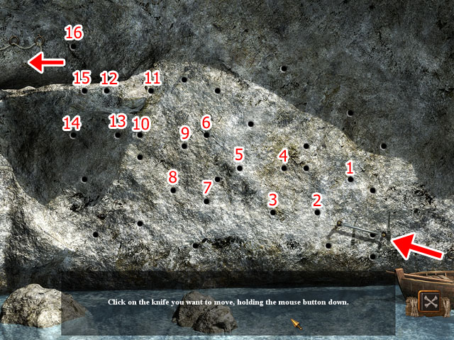 na lodi uvažte loď ke kruhu ve skále (dolů, dolů, nahoru, 4 a 5) a vstupte