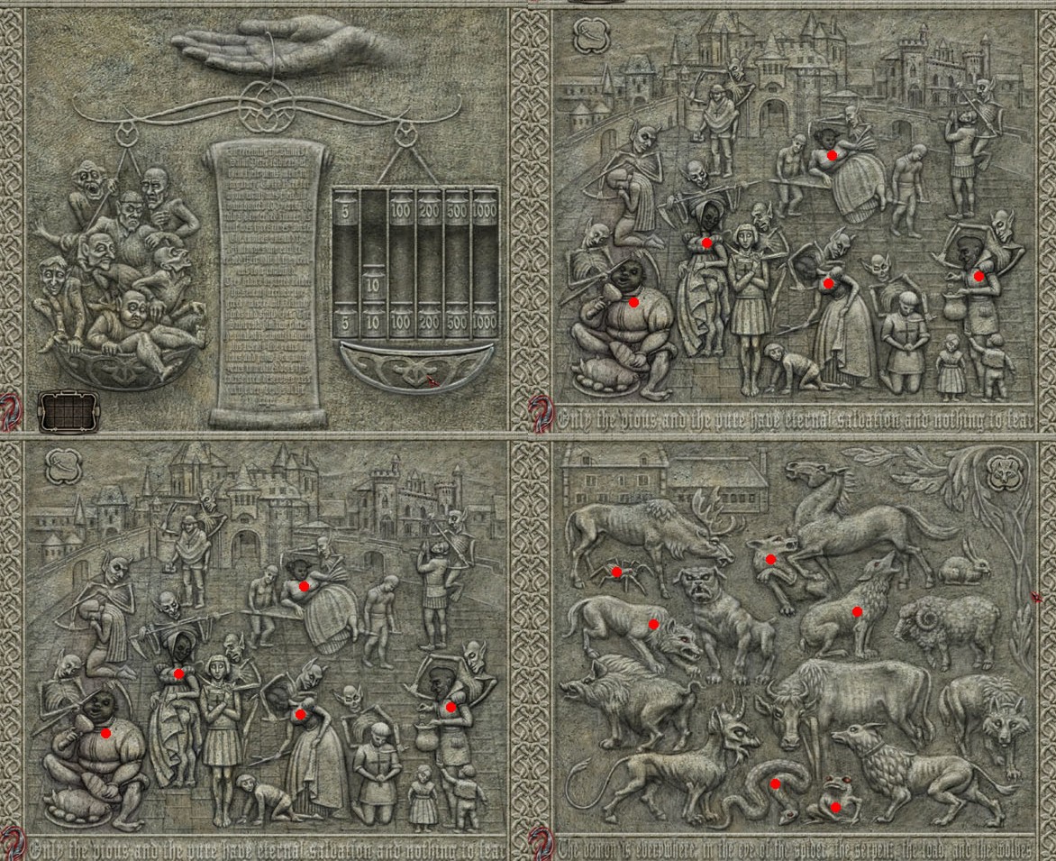 kruhu si všimněte démonů a věřících. U každé postavičky můžete v obdélníku