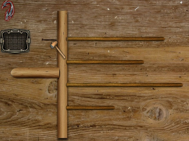 dole vezměte dva háky a kousek výše na stole (napravo od lana nad kbelíkem)