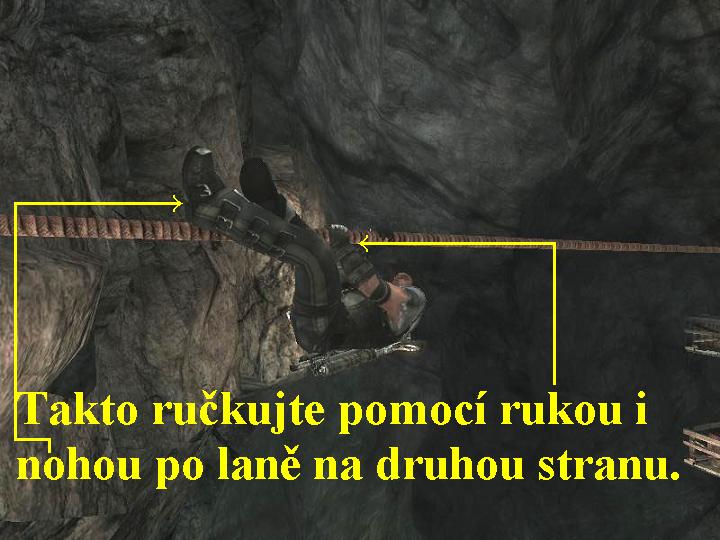 dolů, naskočte na bednu, z ní na lano a přeručkujte si po něm na druhou stranu,